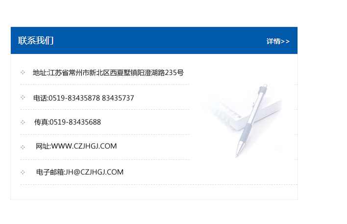 地址:常州市新北區友邦商務大廈1幢16、17層  電話:0519-85101652  傳真:0519-85112595  郵編:213022  網址:www.cz-jiayue_cn.shoujunmuye.com  郵箱:xiajifengaa@163.com
